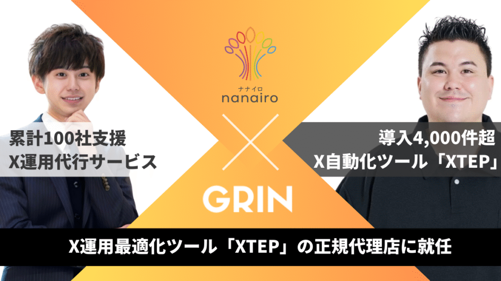 SNS運用代行で累計100社以上の導入実績を持つ株式会社nanairo(本社:東京都渋谷区、代表取締役:瀬戸 敦史、以下 nanairo)は、グリン株式会社(本社:東京都品川区、代表取締役:稲葉 信)が提供するX(旧Twitter)の成果を加速させるX拡張ツール「XTEP(エックステップ)」の正規代理店に就任したことをお知らせいたします。