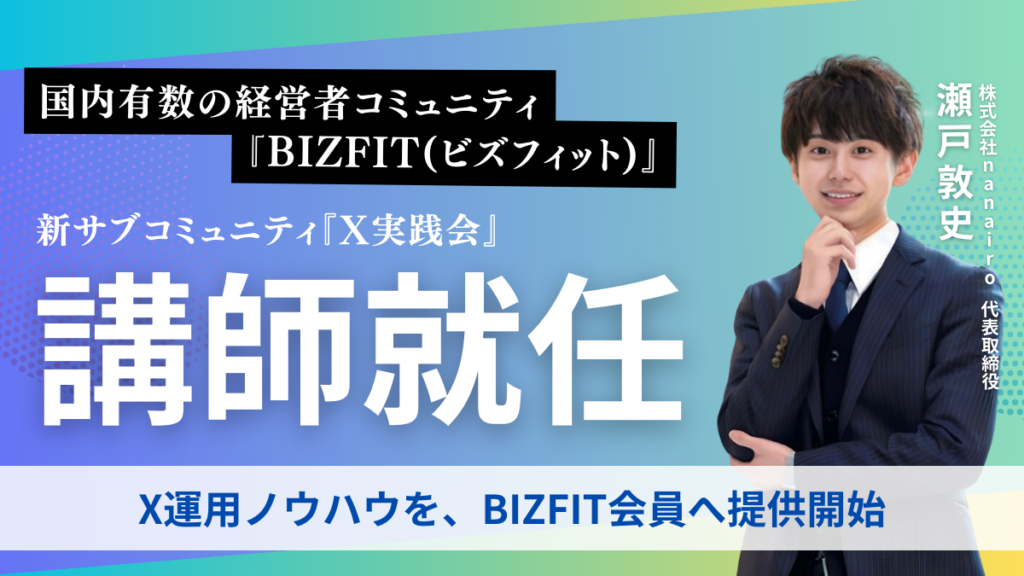 株式会社nanairo(本社:東京都渋谷区、代表取締役:瀬戸 敦史)は、国内有数の経営者コミュニティ「BIZFIT(ビズフィット)」内にて、新サブコミュニティ『X実践会』の講師(コミュニティリーダー)に、当社代表の瀬戸敦史が正式に就任したことをお知らせいたします。
